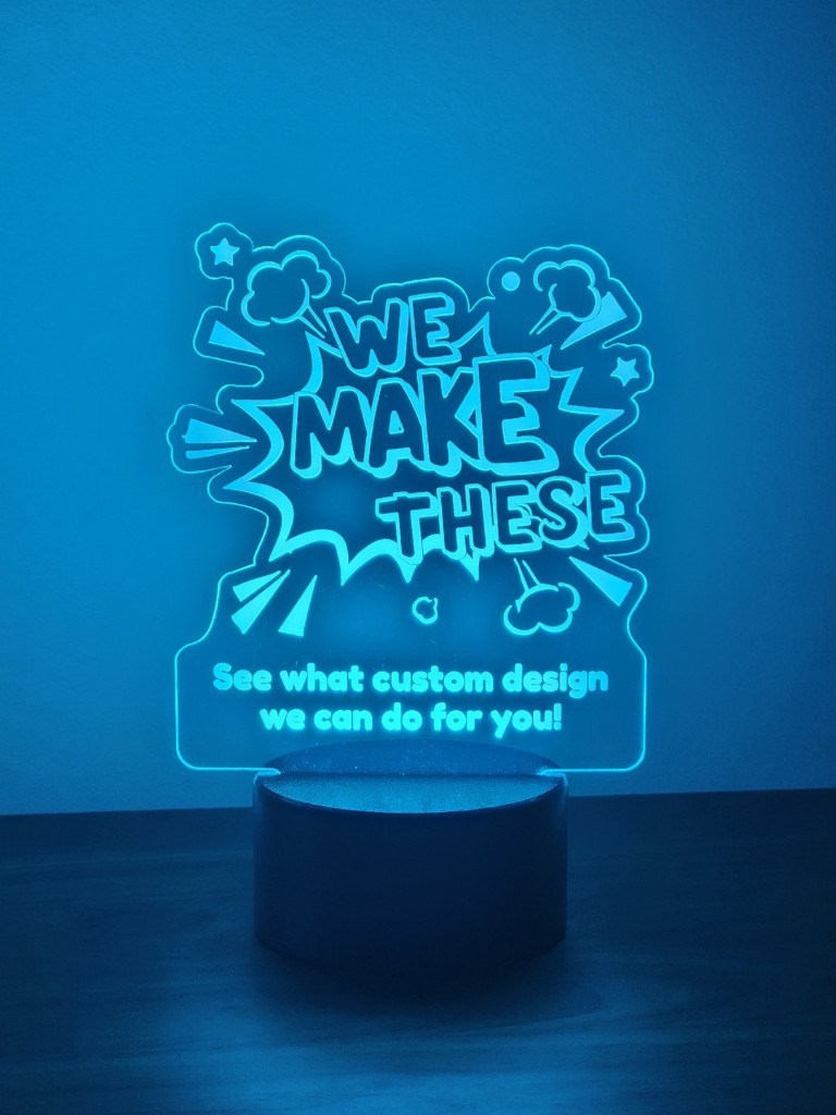 Custom 3D printed LED lightbox signs of your favourite brands, sports teams or other. Perfect for your garage, office or den!